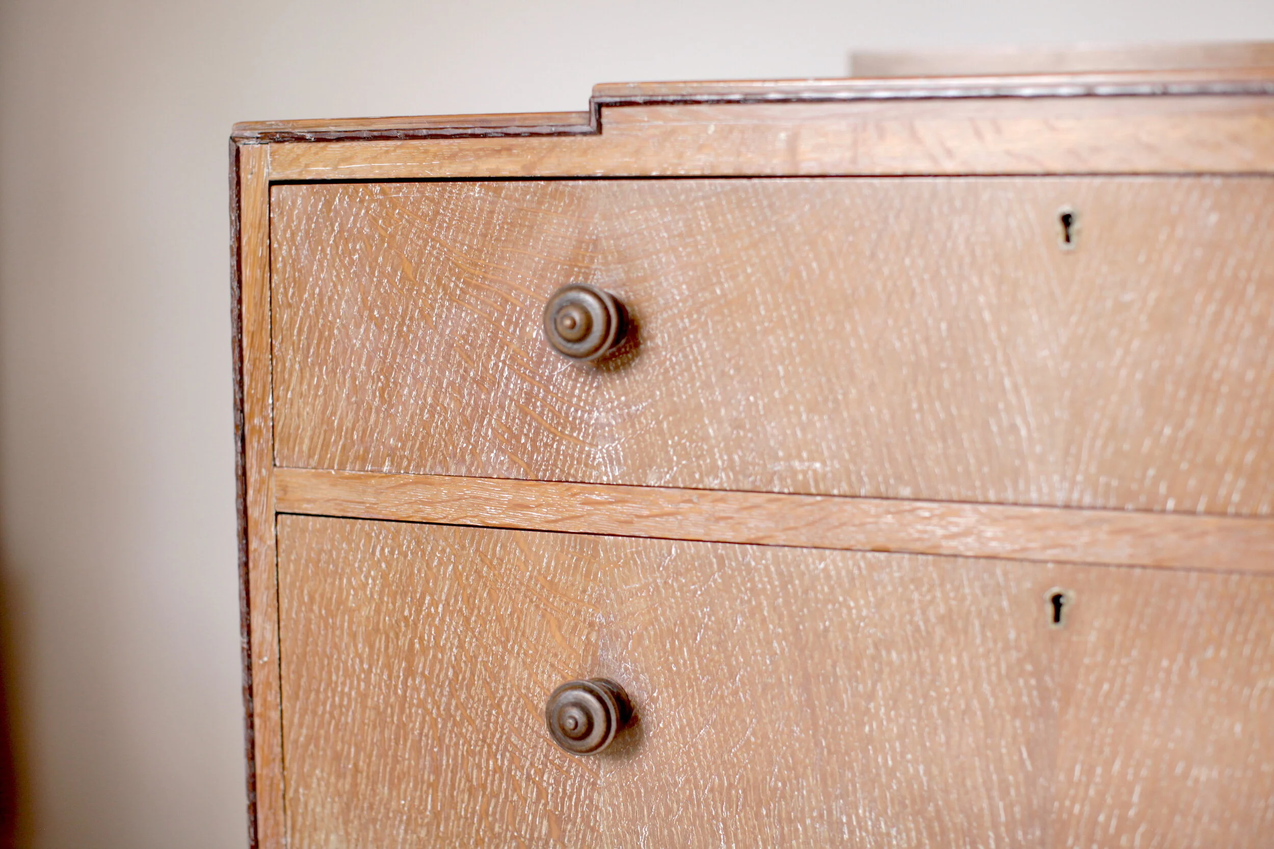 Stunning early 20th Century chest of drawers from the Arts and Crafts movement. Very much in the manner of Heals of London / Cotswold School furniture design with the quality to match. Beautiful quarter sawn oak, solid throughout with a impressive oak veneer front, completed in a limed finish. There is a pretty detail trim around the front edge and stand out octagonal stubby legs. Ultimately this piece has all the elegant form and function of a quality antique without being overly fussy.