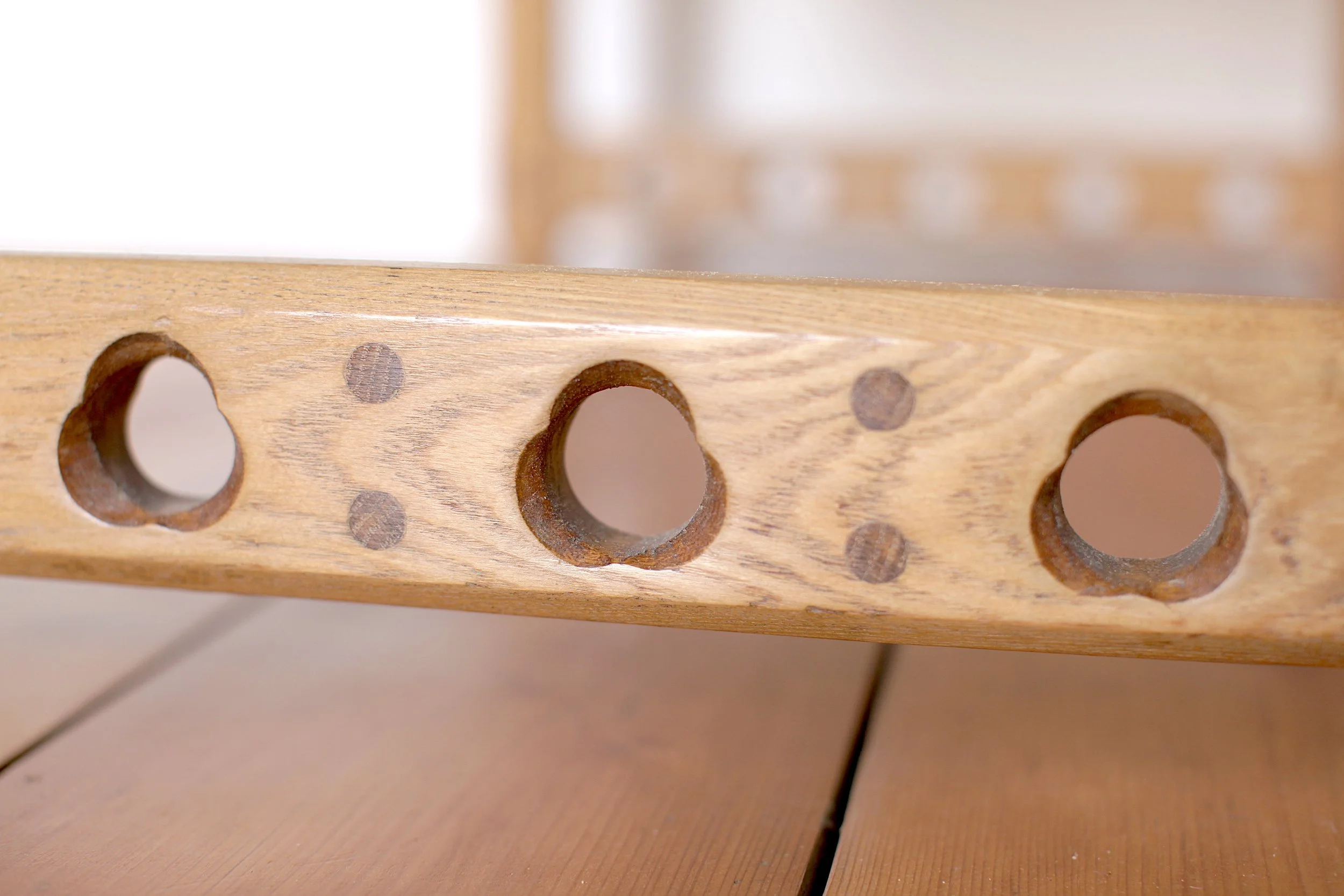 A stunning late 19th Century light oak piece in the classic arts and crafts, Gothic Revival tradition. Exudes the typical design traits of the era; from the elegant detail on the lower stretchers to the pretty inlay on the bottom of each leg. The slender drawers are dovetail jointed.