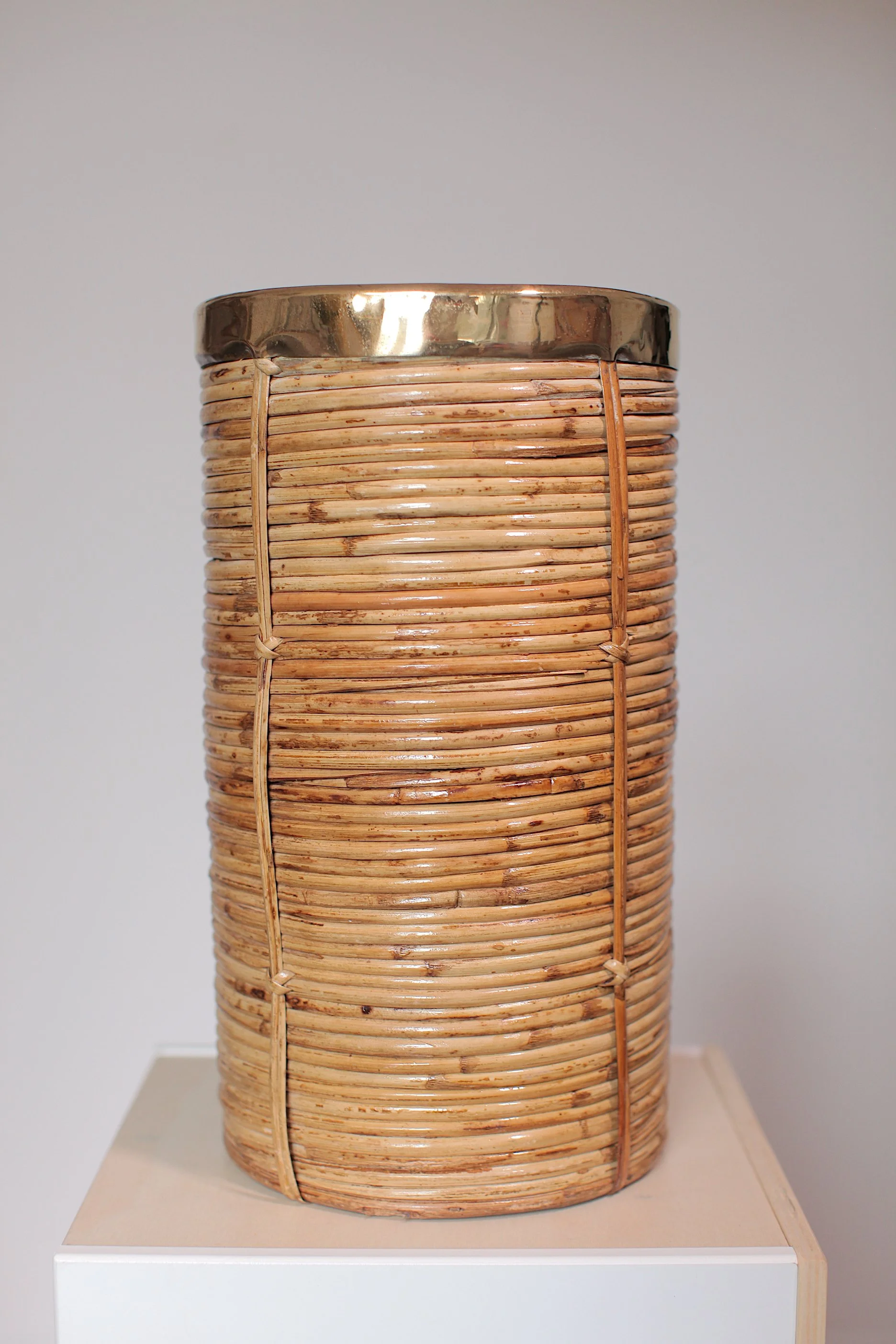 A beautiful Italian Mid Century brass and pencil reed umbrella stand heavily influenced by the designs of Gabriella Crespi. The proportions and contrast of materials is what really gives this piece the look.