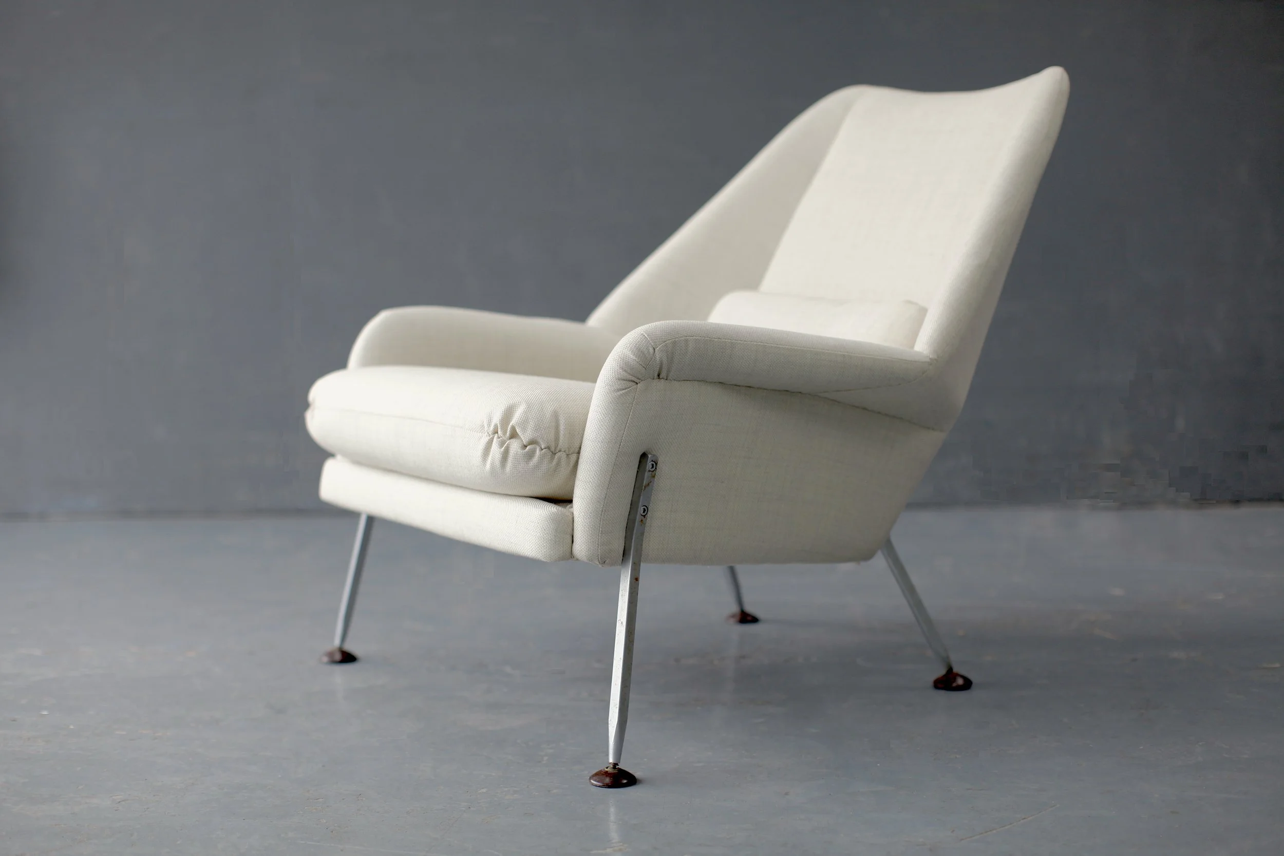 The armchair is exceptionally comfortable having also had the Pirelli webbing freshly replaced in both pieces along with complementary lining added under the seat and footrest cushions. The elegant steel legs are all present with their original feet.