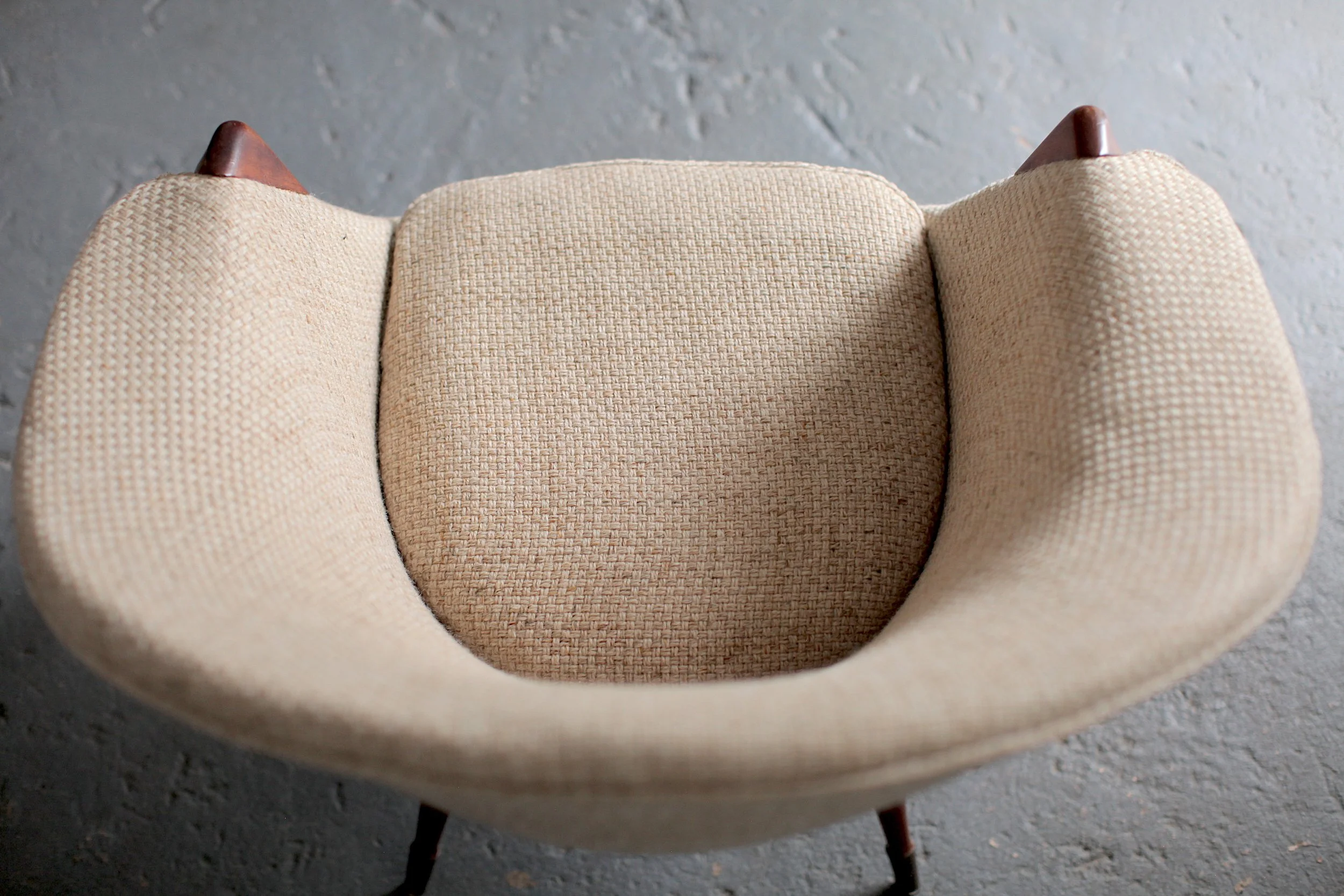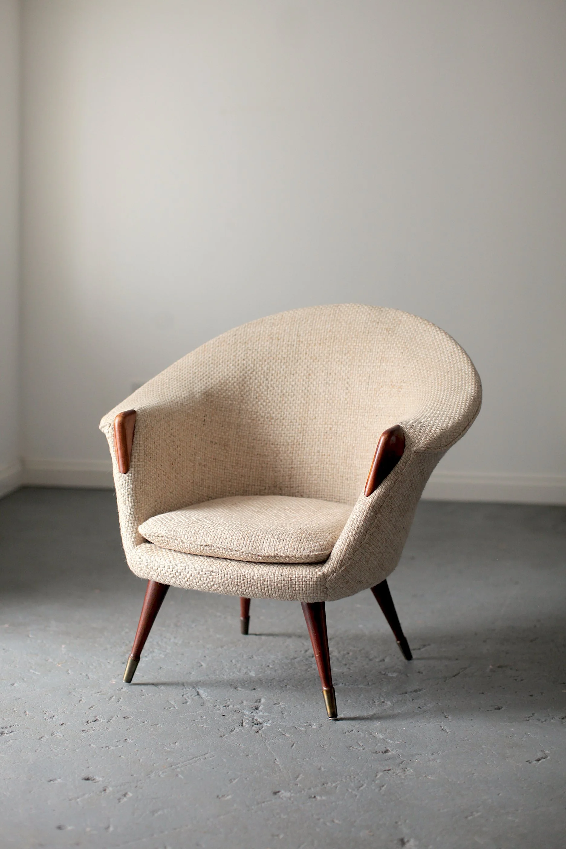 A truly stunning and exceptionally rare mid-century "Rondo" chair by quality British maker, Greaves & Thomas. Strong Danish design influences, so much so that this chair is commonly misattributed to Scandinavian heavyweight designer Nanna Ditzel. In it's original oatmeal wool fabrix which is in incredibly good condition. The chair sits on elegant angled legs with brass detail to the feet.