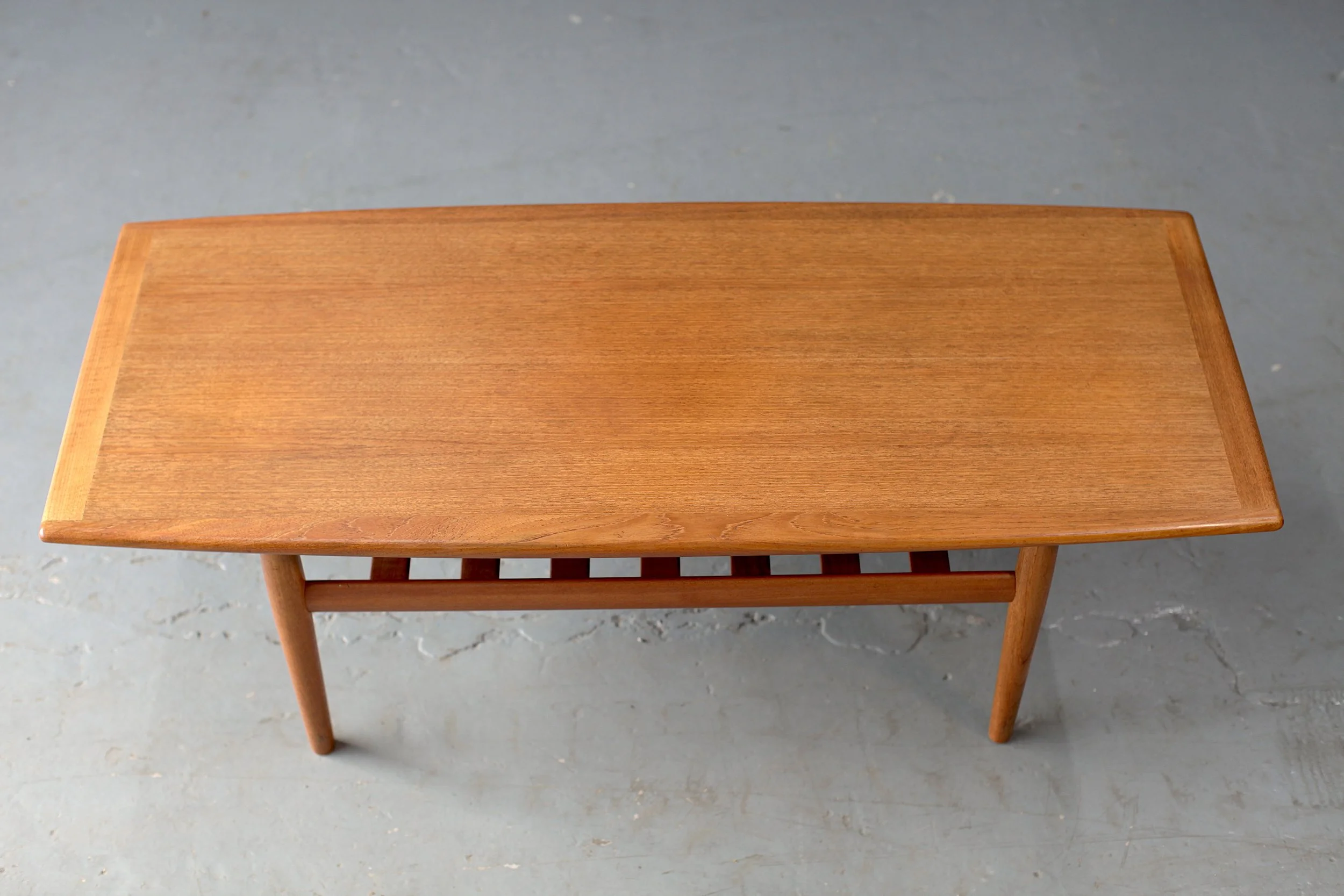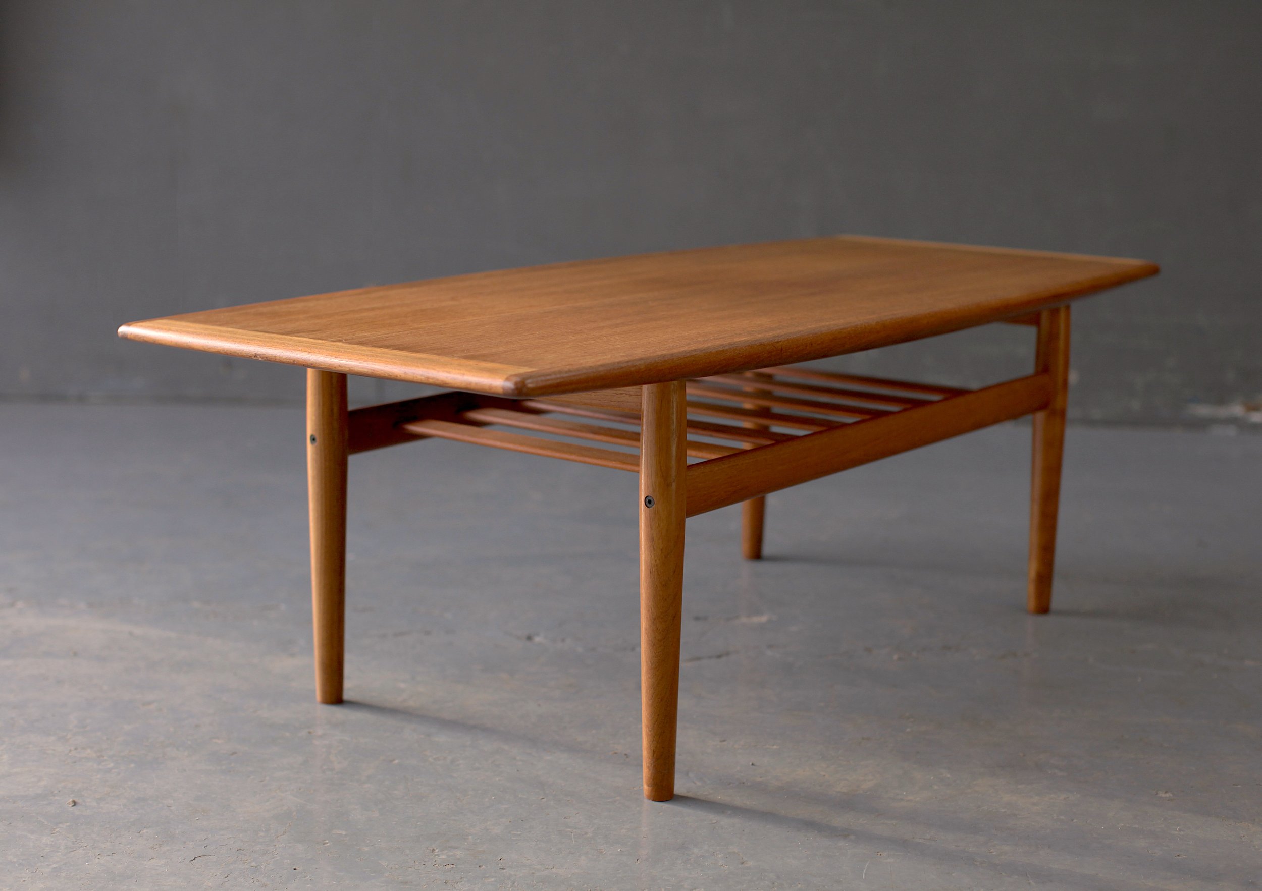 Denmark c1960s. A rare coffee table by heavyweight Danish designer, Grete Jalk. The grain on this table is fantastic and really pops. Complete with slatted magazine rack underneath and signature brass detailing.