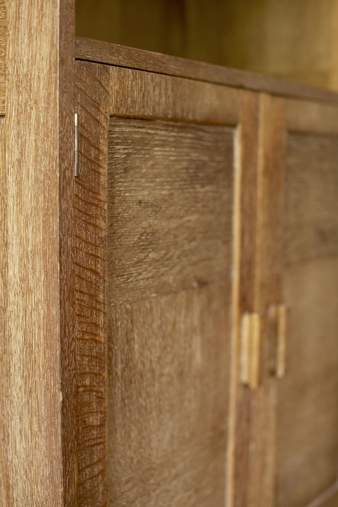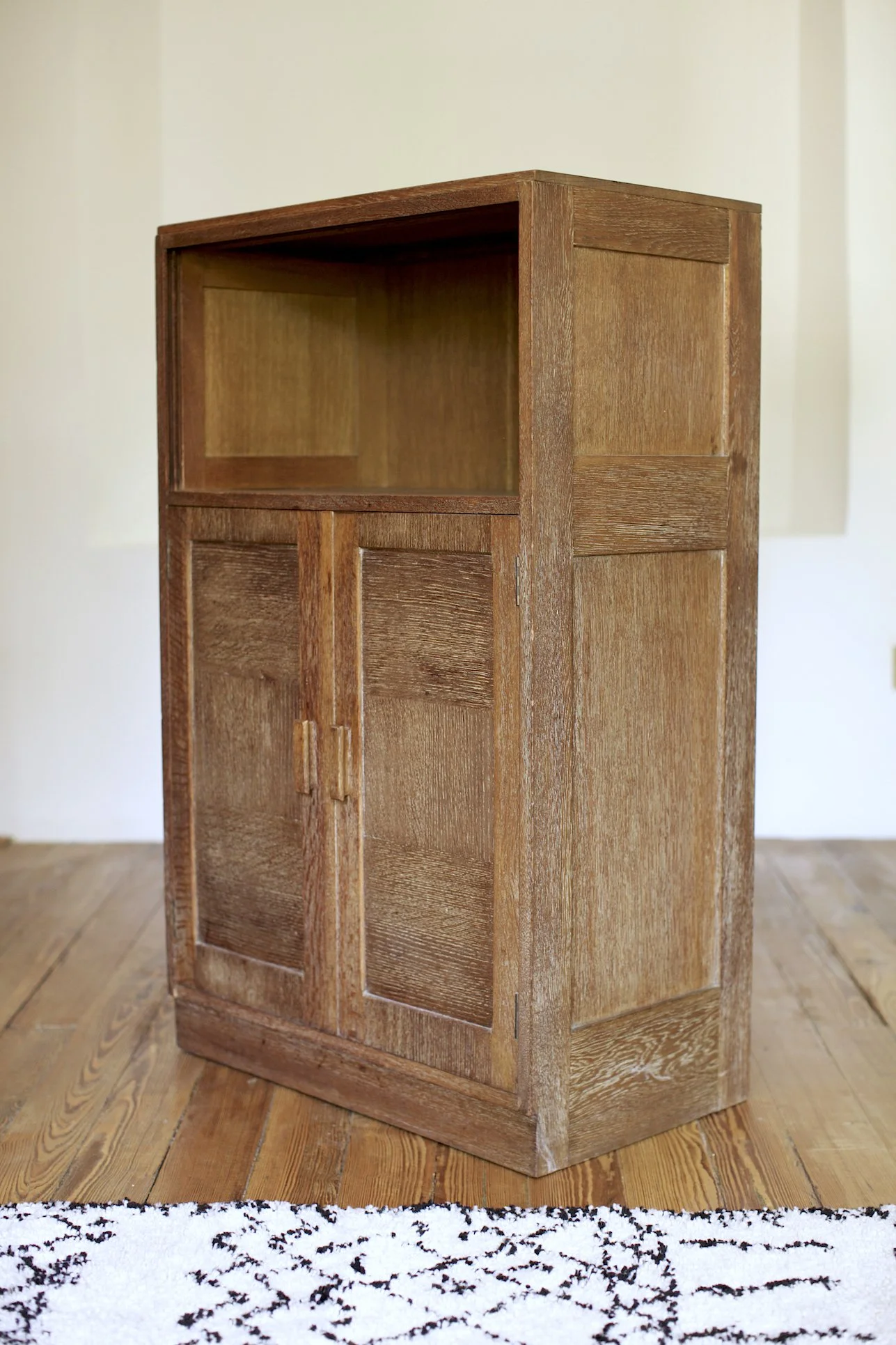 A stunning British, early 20th Century cupboard believed to be by Heals of London with great proportions. This piece is made from quality quarter sawn oak. There is a useful shelf section above the cupboard that contains an internal shelf. While this piece does not have the Heal’s ivorine label, the liming, the handles and especially the colour tone are very much in the typical Heals vernacular