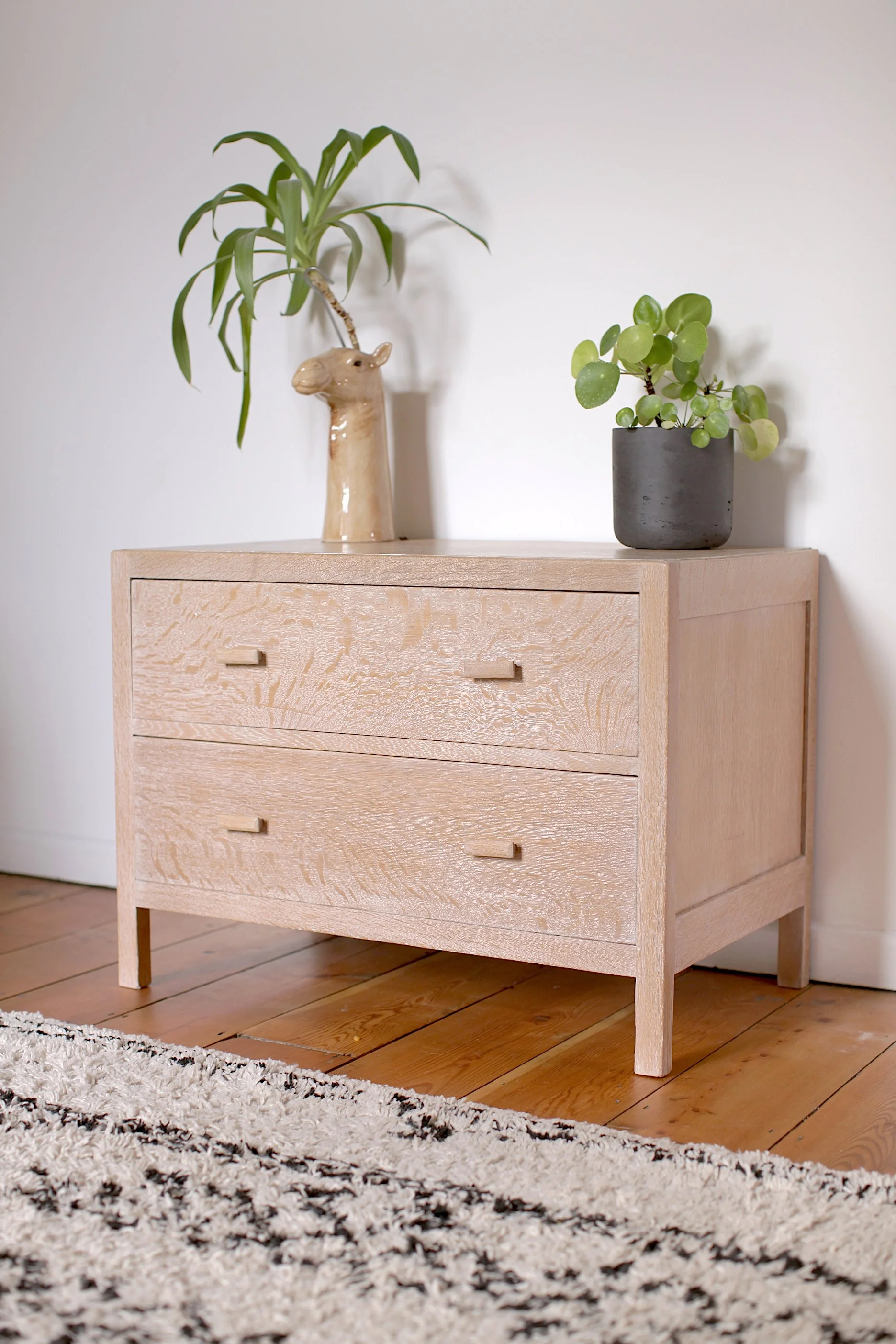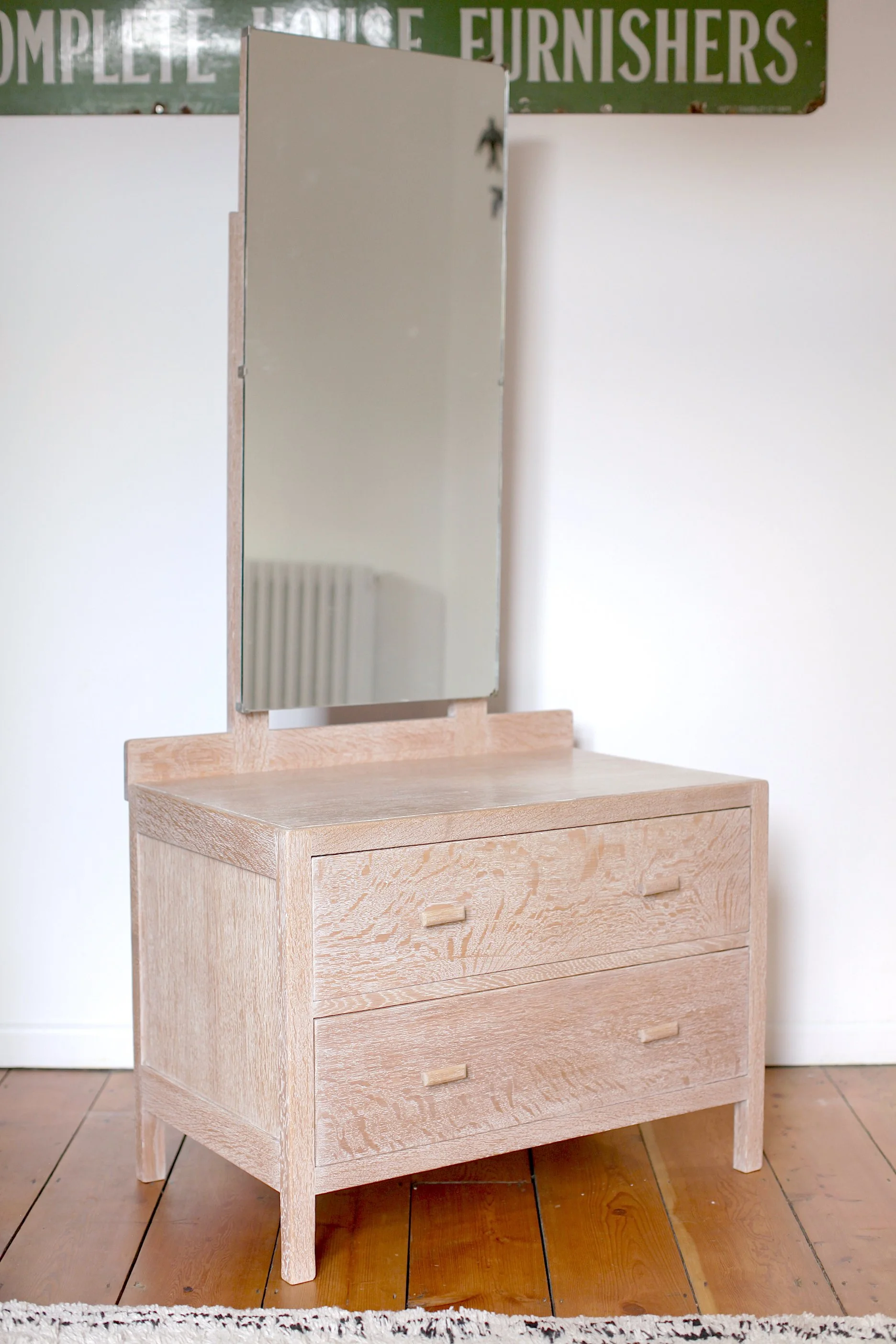 British, c1920s. A quality early 20th Century 2 drawer oak dressing chest of drawers by the renowned London department store Heal & Son of Tottenham Court Road. This limed oak finish was one of their classic design trademarks of the era. The mirror section is on an adjustable hinge and is easily removable along with the supporting frame. See last photos including mirror