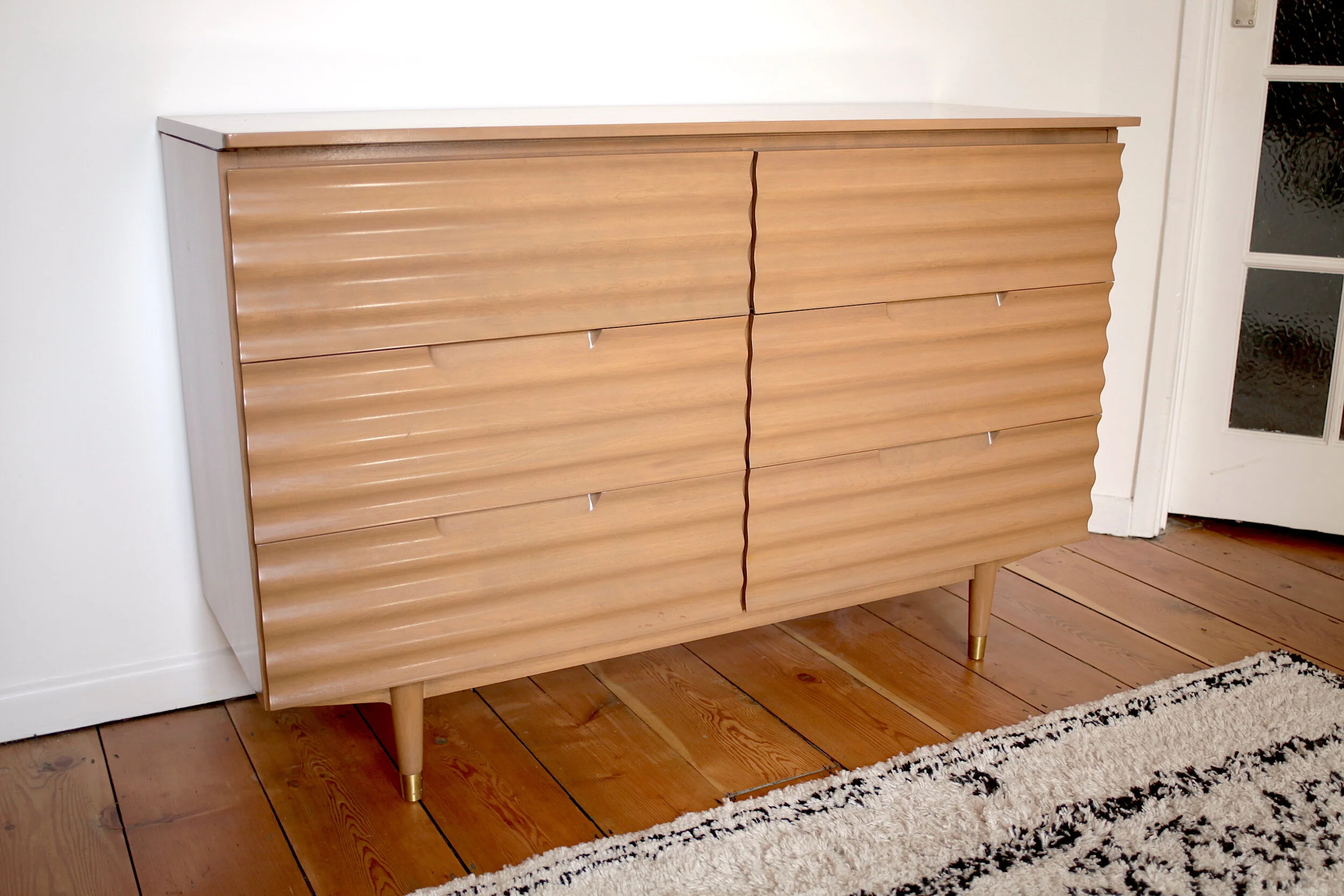 Canada, c1950s. Stunning, wave front, 6 drawers sideboard with quality brass detail feet made from solid Birch.