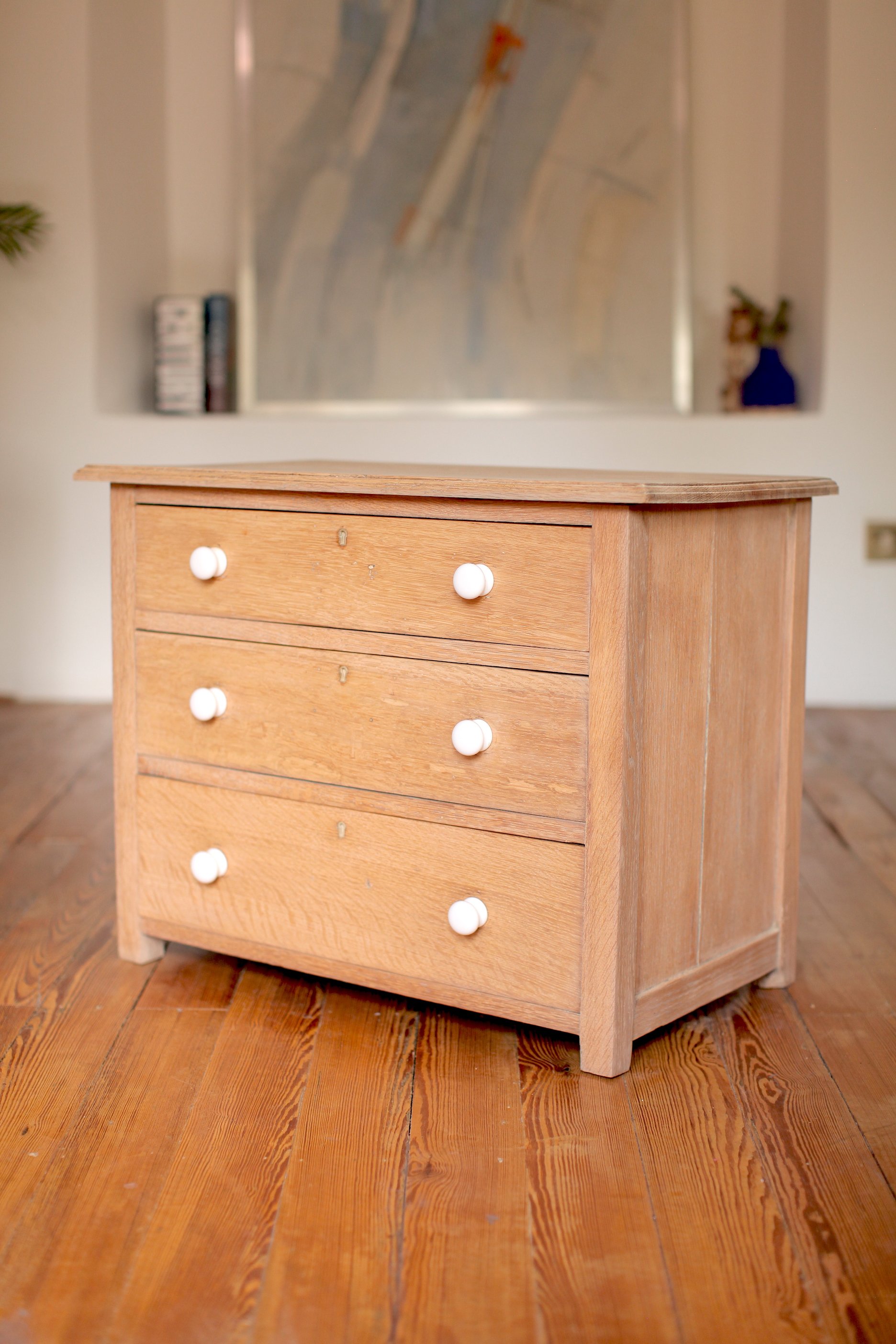 A cute British chest of drawers dating to the early 20th Century in a gorgeous pale quarter sawn oak. With 3 graduating drawers and stubby legs, the lovely proportions of this piece would make for an excellent television unit if not a more traditional smaller chest of drawers.