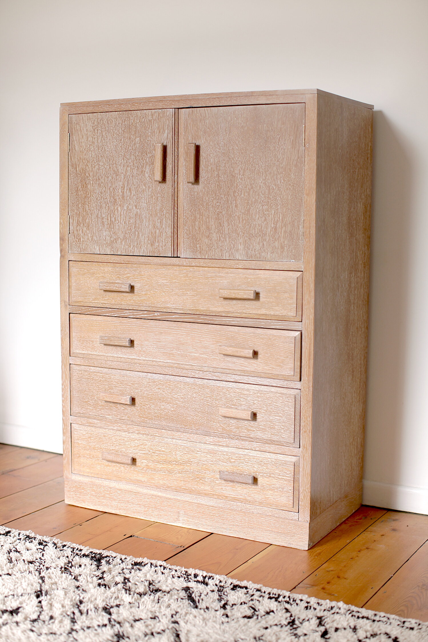 The tallboy is in very good refinished condition with only very minor signs of wear and tear commensurate with age. The piece has been completely refinished with a delicate hand sand, freshly limed and then extensivelty beeswax polished. There are some stains to the inside of the cupboard section however the interior has been lightly sanded and cleaned.