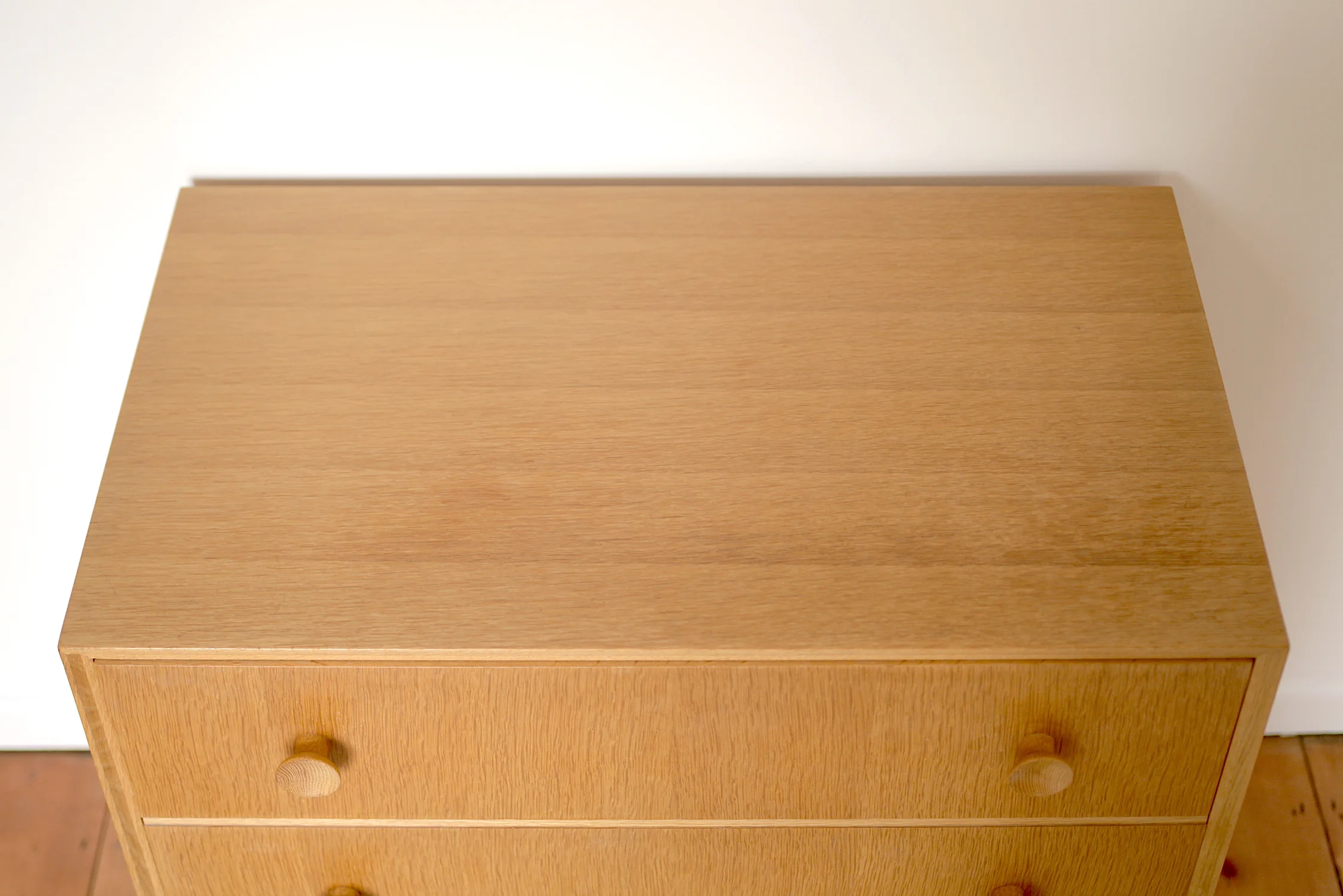 c1960s. British. Beautifully proportioned chest of 3 drawers in light oak by quality British maker Meredew. Pretty oak handles and simple elegant lines with Danish design inspired stubby tapering legs.