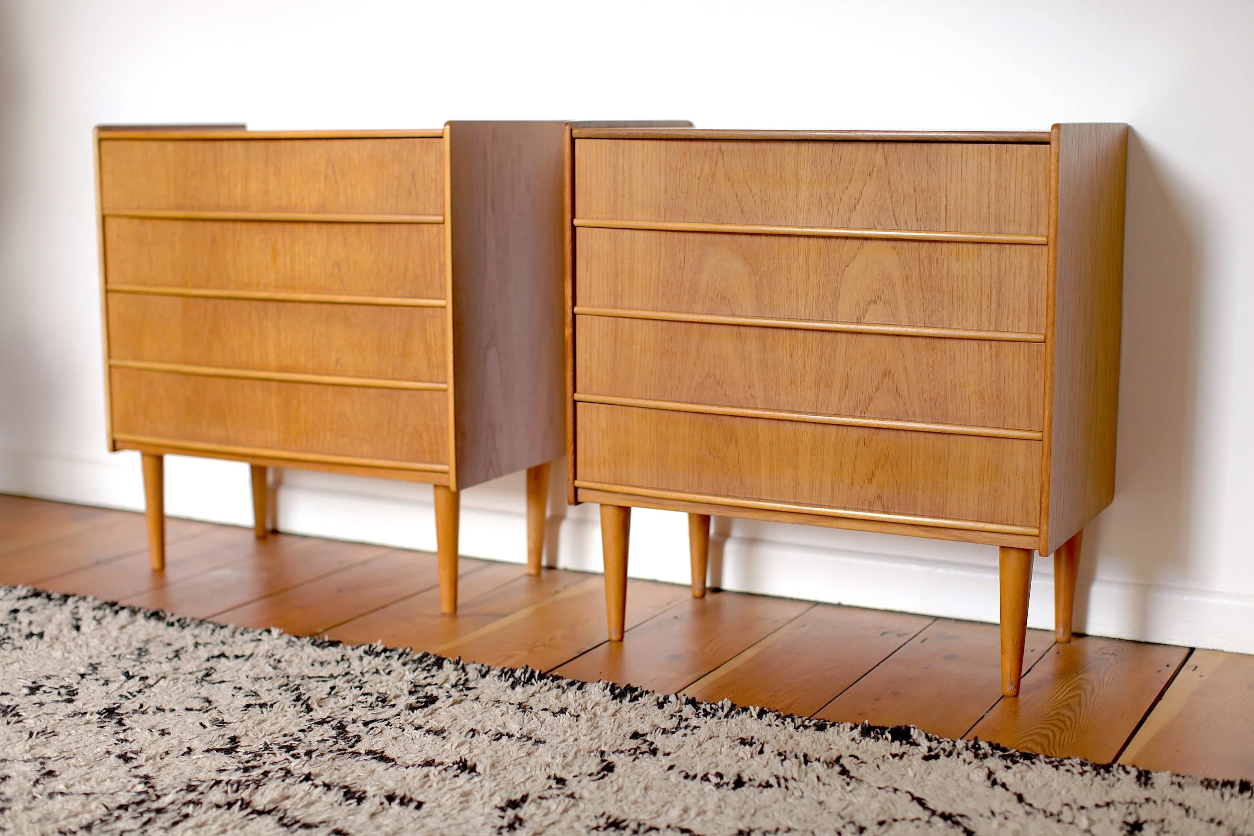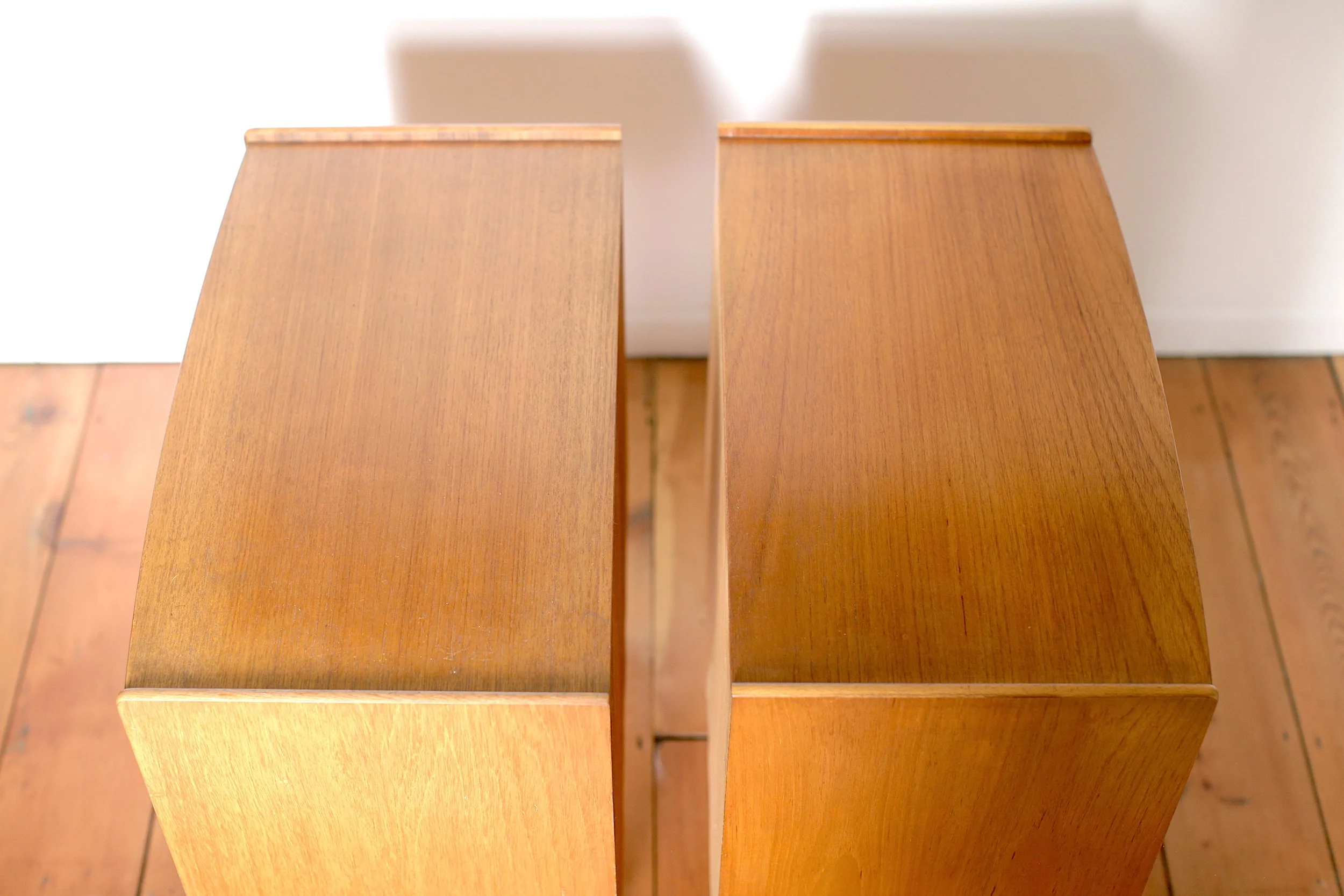 Norway, 1960s. Great things come in small packages as this truely exceptional pair of teak drawers proves. Produced by quality Scandinavian maker Skie & Co they have a beautiful teak finish, elegant tapering legs and low profile handles. Would make the perfect pair of nightstands or elegant side table units.