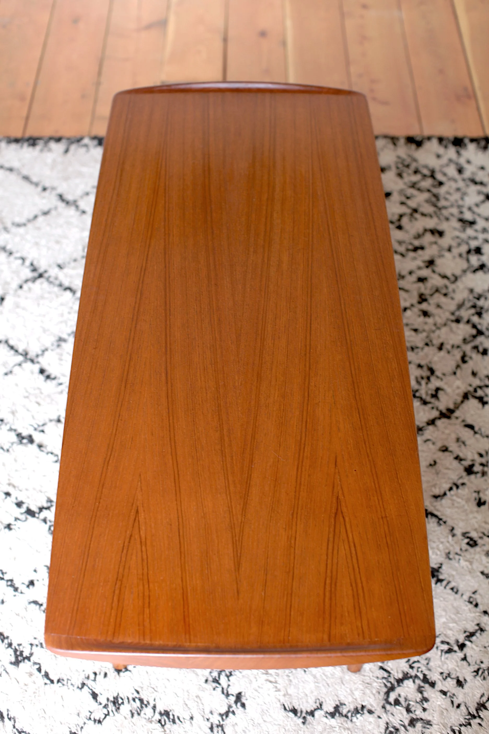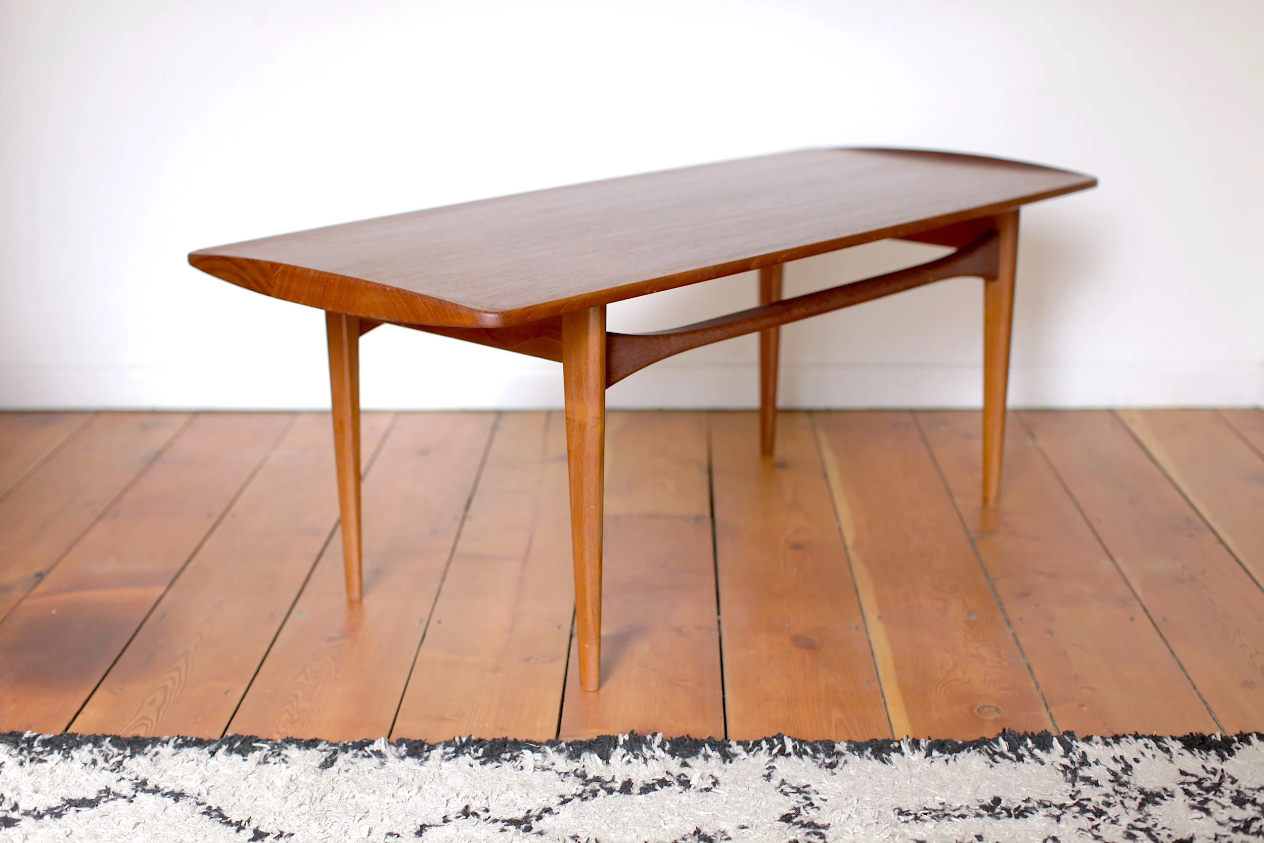 Danish c1960s. Stunning solid teak grain coffee table by Danish husband & wife design duo Tove & Edvard Kindt Larsen. Lovely curved lip ends and shaped tapering legs with elegant stretchers. Complete with maker label that dates this table to the mid 1960s